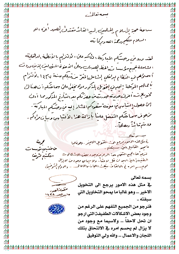 توضيح بعض مضامين الوصية المباركة فيما يتعلق بالتخويلات استفتاء السيد القائد مقتدى الصدر اعزه الله 13 4 2017 منتدى جامع الائمة الثقافي